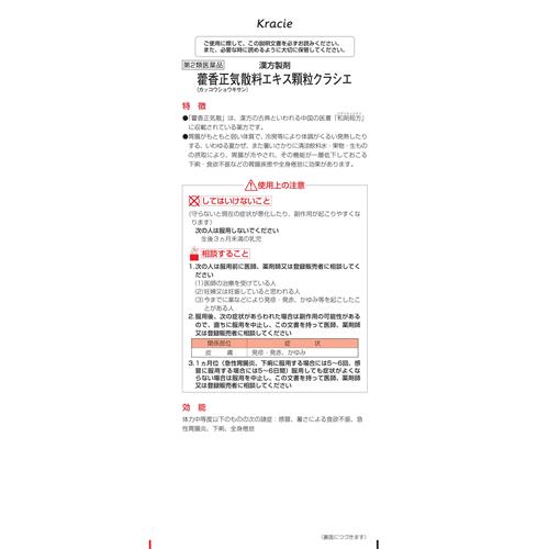 カッ香正気散料エキス粉末 1750mg (ビャクジュツ・ハンゲ・ブクリョウ各1.5gコウボク・チンピ各1.0gキキョウ・ビャクシ各0.75gソヨウ・カッコウ・ダイフクヒ・タイソウ・ショウキョウ・カンゾウ各0.5gより抽出。)添加物として、乳糖、ケイ酸Al、ヒドロキシプロピルセルロースを含有する。