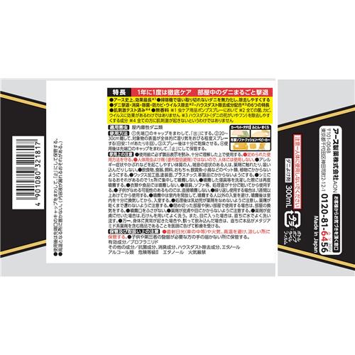 ●1年に1度は徹底ケア●部屋中のダニまるごと撃退●アース史上、効果最長※虫ケア用品ポンプスプレーにおいて●掃除機で吸い取り切れないダニを無力化し、除去しやすくする●ダニ撃退・消臭・除菌・防カビ・ウイルス除去(※全ての菌、カビ、ウイルスに効果があるわけではありません)・ハウスダスト除去成分配合(ハウスダスト(ダニの死がいやフン)を除去しやすくする成分)の6つの特長●肌刺激テスト済み※全ての方に肌刺激が起きないというわけではありません●無香料●赤ちゃん・ペットがいるご家庭にも【適用害虫】屋内塵性ダニ類【ダニよけ剤】