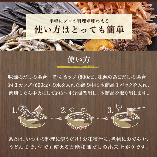 だしパックの個包装を開封して、炒め物などに粉末調味料としてもお使いいただけます。調理時に味を確かめながらお好みで調節してください。