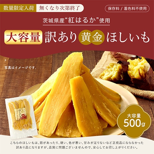 名称:ほしいも 原材料:さつまいも(紅はるか) 原産国名:日本(茨城県) 内容量:500g 賞味期限:製造日より約90日 保存方法:直射日光、高温・多湿を避けて常温で保存してください。 開封後は、お早めにお召し上がり下さい。 販売者 有限会社 味源 (美味しさは元気の源 自然の館)香川県仲多度郡まんのう町宮田1019-16 製造者 大印(株)大文字屋商店 茨城県ひたちなか市湊泉町3-12 ご注意: ほしいもの表面に白い粉が発生することがありますが、糖分が結晶化したものです。 また、表面にいもの皮やひげの根の付着、繊維や黒ずみがみられることがありますが、いずれも品質には問題ございませんので、安心してお召し上がり下さい。 筋があったり、硬い、色が悪い、甘みが足りないなど正規品にならなかった訳あり品になりますが、品質に問題ございませんので、安心してお召し上がりください。 ほしいもが重なった状態など、見た目・梱包に偏りがある場合がございます。ご家庭用としてお楽しみください。