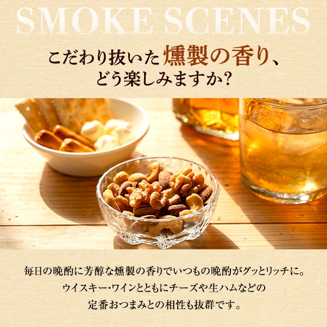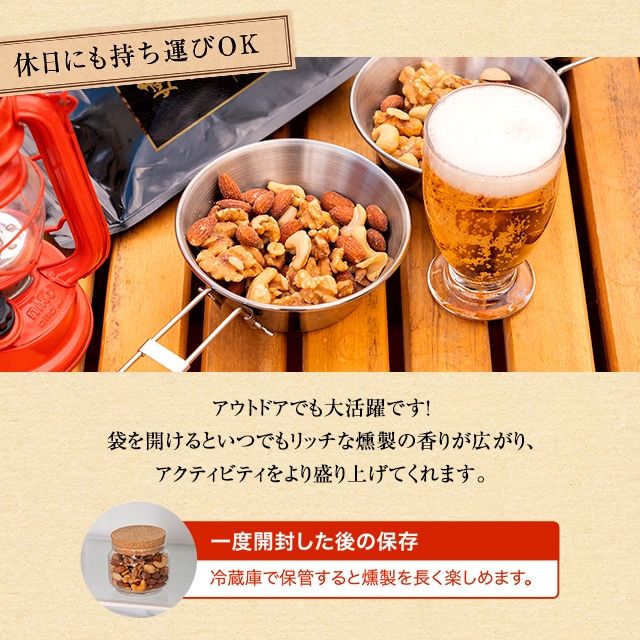 原材料名(産地) :燻製アーモンド(アーモンド(アメリカ)、植物油、食塩)、燻製くるみ、燻製カシューナッツ(カシューナッツ、植物油、食塩)、燻製ピスタチオ(殻付きピスタチオ、食塩)、食塩/調味料(アミノ酸等) 内容量 :200g 賞味期限: 製造日より約185日 保存方法:直射日光、高温・多湿を避け、常温で保存下さい。