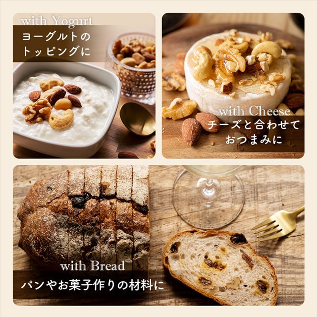 有塩:アーモンド、くるみ、カシューナッツ、マカダミアナッツ、食塩