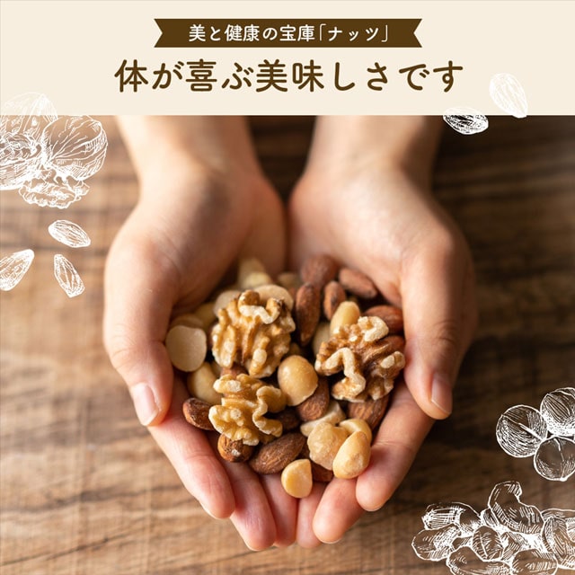 原材料名(産地) 無塩:アーモンド、くるみ、カシューナッツ、マカダミアナッツ 有塩:アーモンド、くるみ、カシューナッツ、マカダミアナッツ、食塩 産地:アーモンド・くるみ(アメリカ)、カシューナッツ(インド、ケニア、タンザニア、ベトナム)、マカダミアナッツ(オーストラリア、ケニア、マラウイ、南アフリカ) 内容量 600g 賞味期限 製造日より約185日 ※使用しているアーモンドは粒の形が長く扁平な外観が特徴でございます。味が淡白で食感が柔らかいため、湿気たように感じる場合がございますが、アーモンドの品種によるもので品質には問題ございませんので、ご安心いただけますと幸いです。 ※商品内に入っている細かい粉は、クルミなどの渋皮によるものです。品質等に問題はございません。 ※くるみに黒いシミがある場合がございますが、くるみの渋皮が日に焼けて黒くなる現象です。品質に問題はありません。 ※当工場では小麦、そば、卵、乳成分、落花生、エビ、カニを含む製品を製造しています ※原料は選別しておりますが、除去しきれないくるみの殻が残っている場合があります。召し上がりの際は十分ご注意ください。