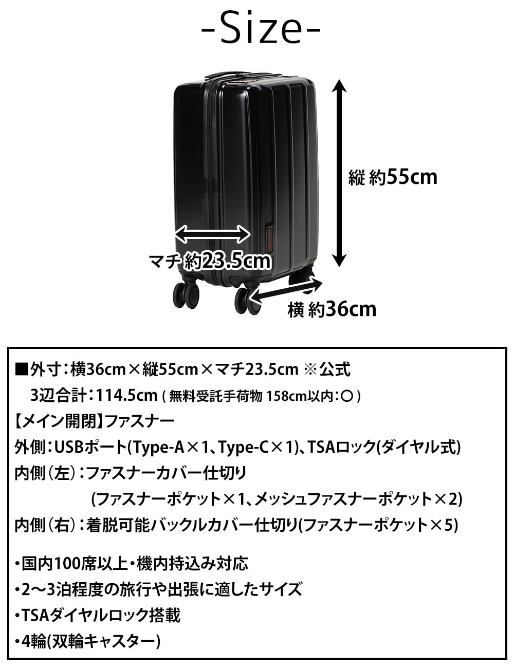 キャリーハンドルは5段階調節、ファスナーはTSAロック対応、USBポートでスマホ充電も可能と、旅の快適さを高める機能が揃っています。