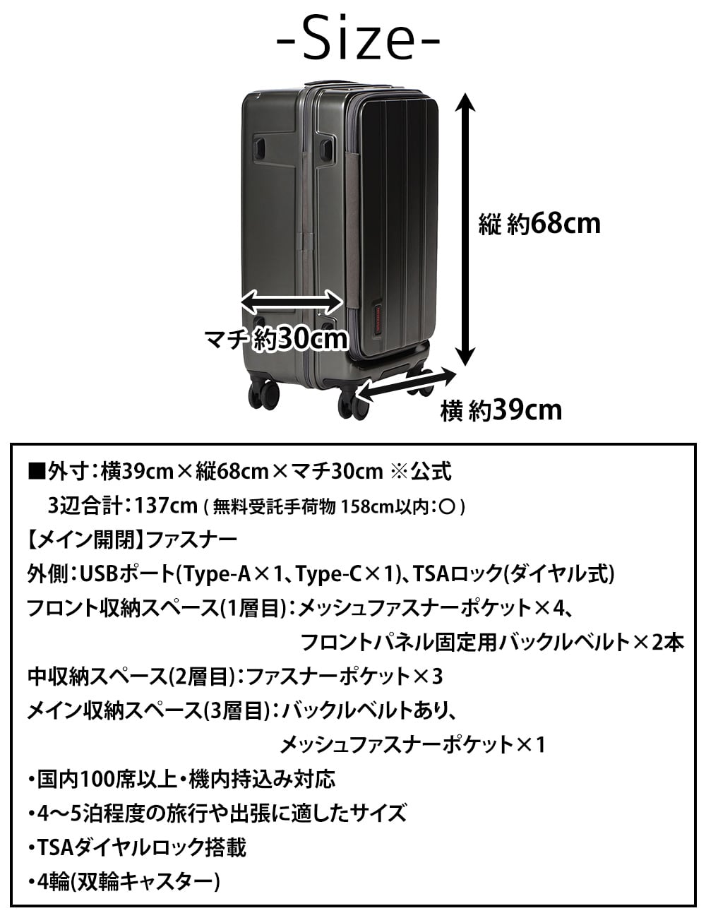 3~5泊程度の旅行や出張の心強いパートナーとして、長く安心して使える一台です。
