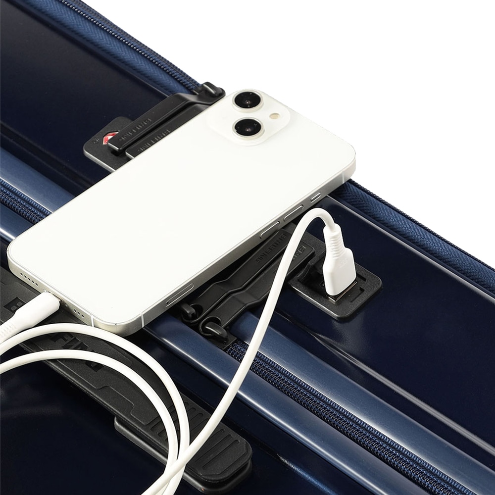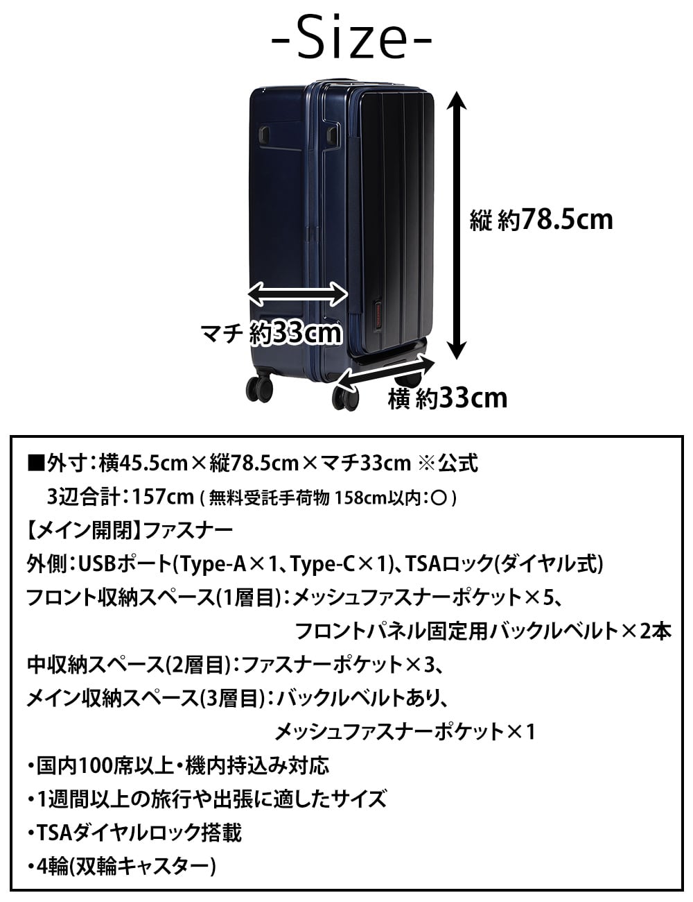キャリーハンドルは2段階調節、TSAロック対応ファスナー、USBポートでのスマホ充電など、長旅を快適にする機能がしっかり揃っています。