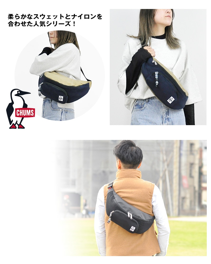 カジュアルな雰囲気のスウェットをメインに、負荷が多くかかる箇所には機能性の高いナイロンを合わせたCHUMS定番のバッグシリーズ。