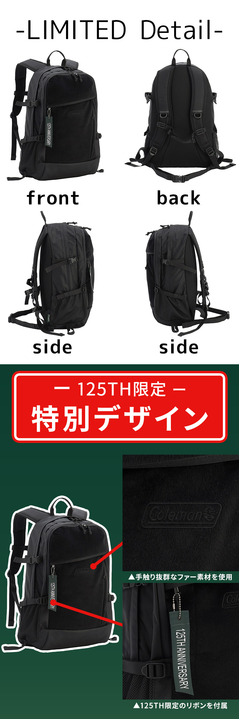 ■フロントはアクセントになるリッチなエコファー素材(125THブラック限定)