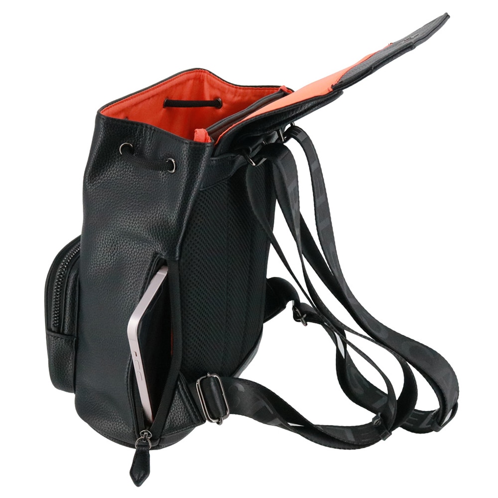 フラップのエンボスロゴや立体的な家紋デザインがブランドらしさを演出したリュック。