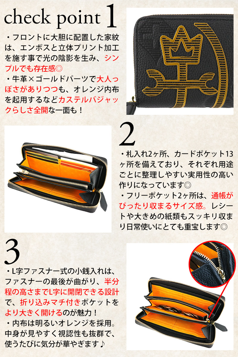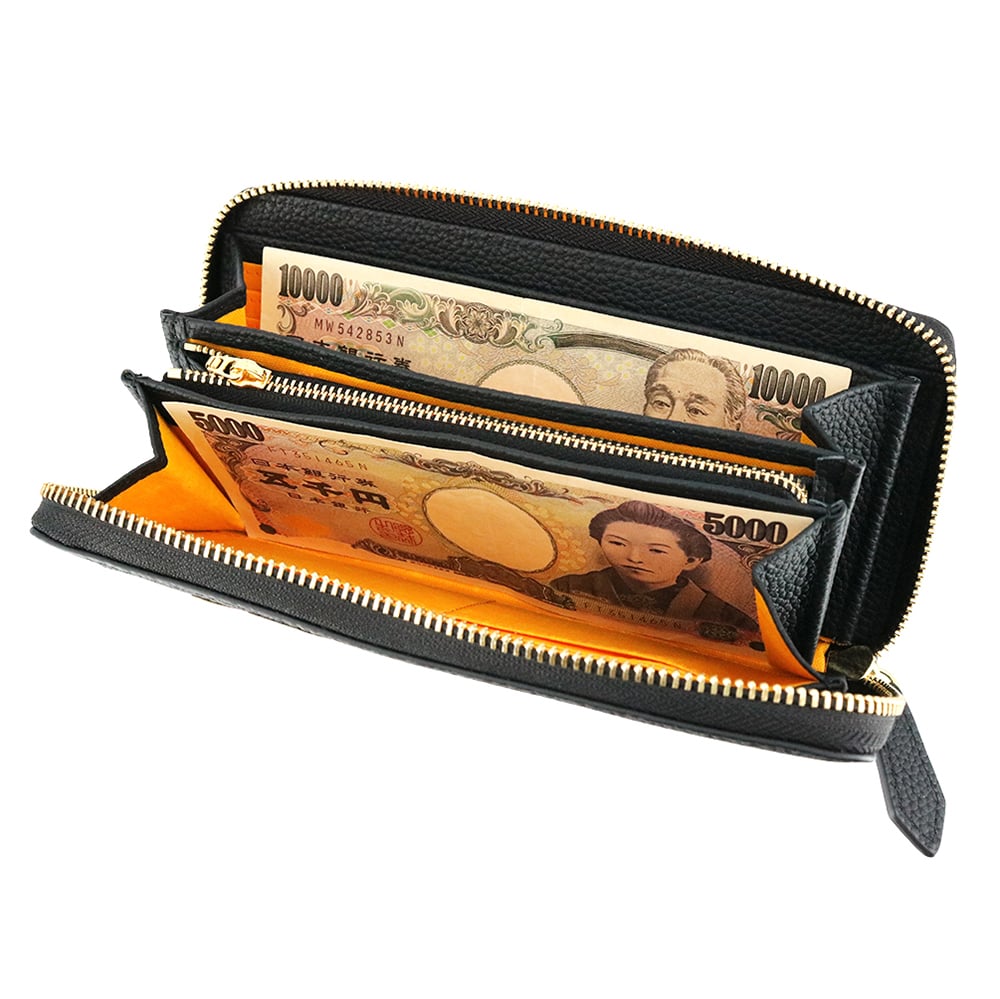 札入れやカードポケット、フリーポケットが充実しており、用途ごとにお金の個別管理が出来る実用性の高い作りになっています。