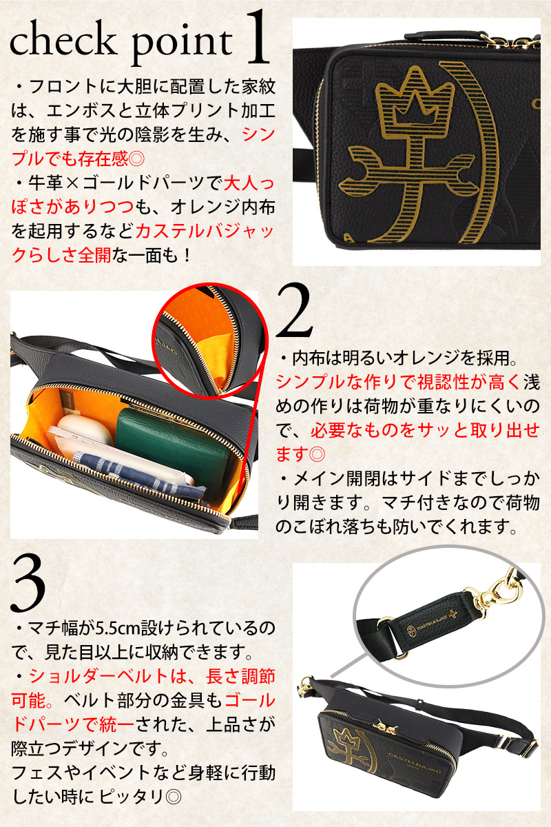 フロントに大きくあしらわれた家紋が目を惹く、“カステルバジャックらしさ”を大人向けに表現した【カヌレ】シリーズ。