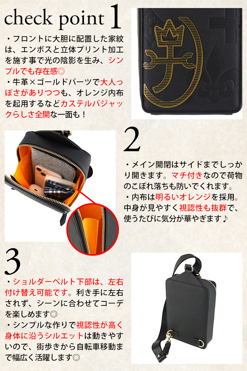 フロントに大きくあしらわれた家紋が目を惹く、“カステルバジャックらしさ”を大人向けに表現した【カヌレ】シリーズ。