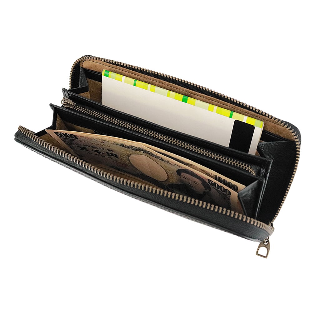 カードも紙幣も硬貨もきっちり仕分けできるラウンドファスナー仕様の長財布。
