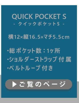 クイックポケットS(QUICK POCKET S)は様々な携帯の仕方が出来るコンパクトなポーチです。手元に置いておきたい携帯電話やカメラを収納するのに最適です。貴重品プラスαの手荷物なら、このポーチ一つで十分です。