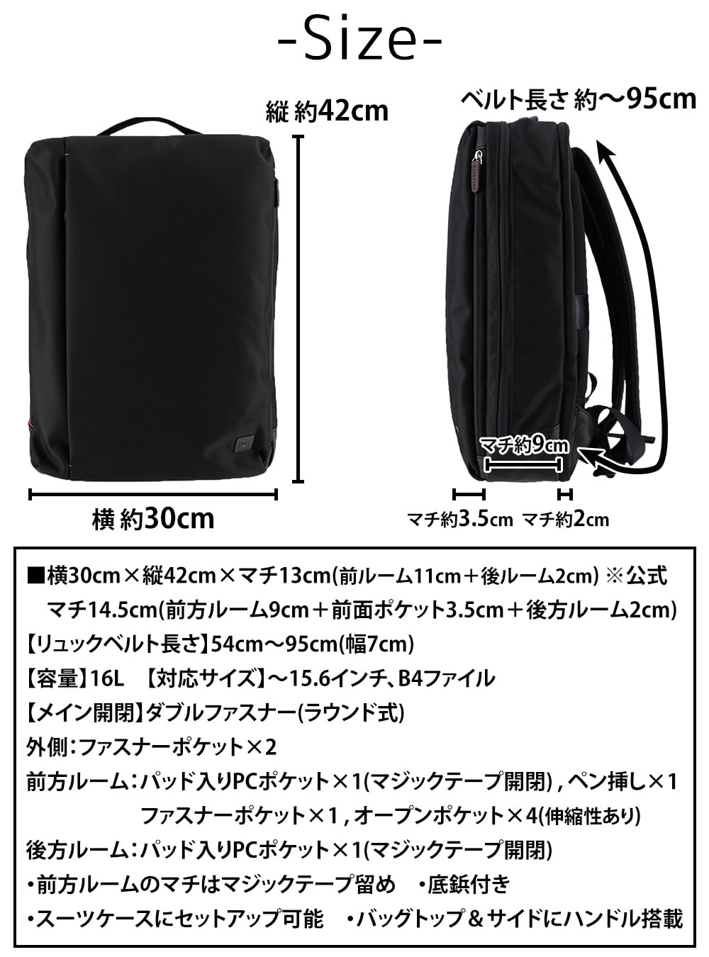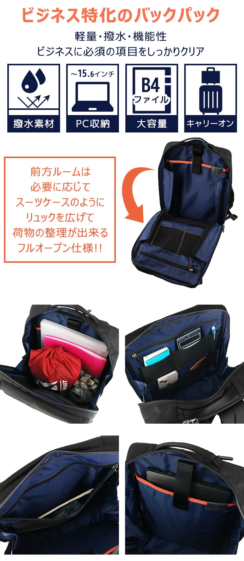 15.6インチノートPCやB4ファイルをはじめ、必要なガジェットをしっかり管理出来る便利なポケットが盛り沢山。