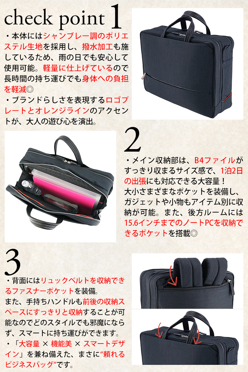 エコ通勤やジャケットスタイルにも合うB4ビジネスバッグは2層タイプで、1泊2日の出張にも対応した大容量サイズの3WAY仕様。