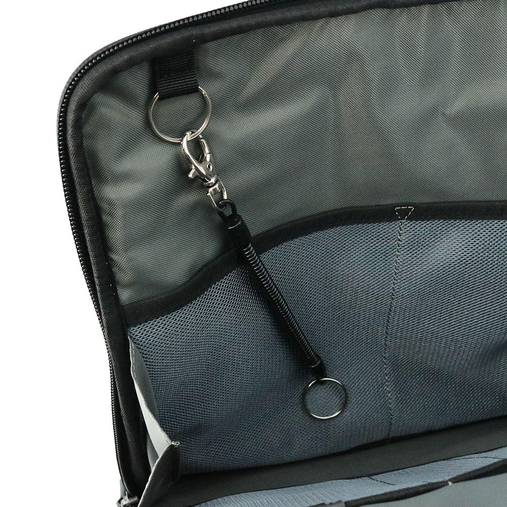 バネ式キーリングは前面ファスナーポケット(大)内の二重リングに取り付け可能