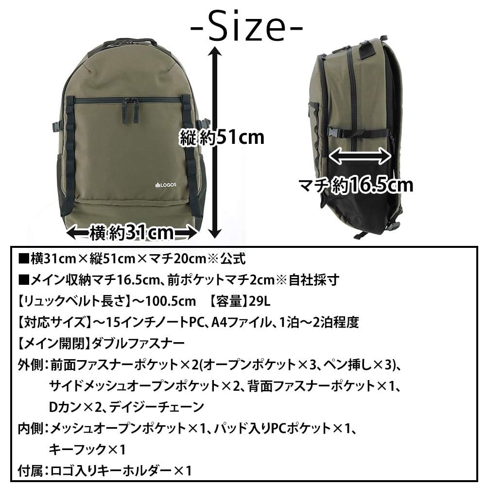 普段の通勤やお買い物、旅行、アウトドアにも使いやすい容量29Lで、1泊2日~上手に収納すれば2泊程度の着替えも入ります。