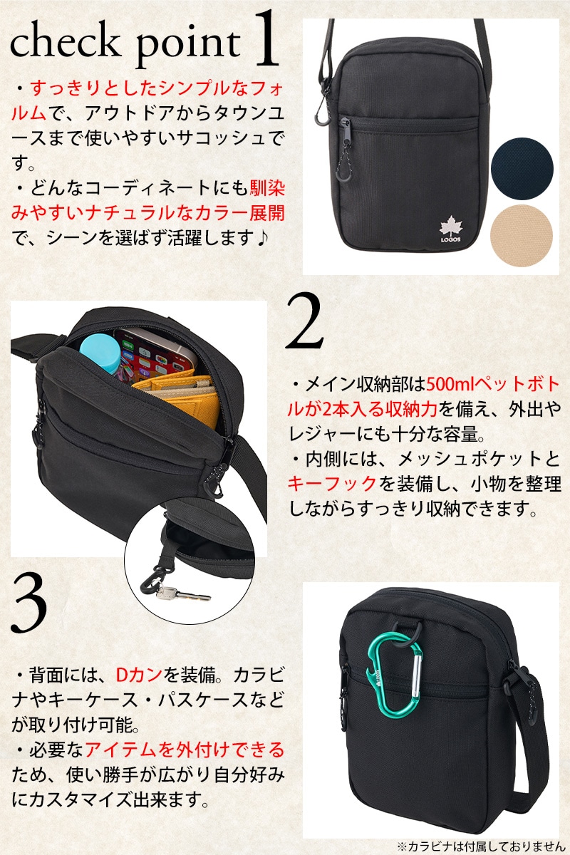 500mlのペットボトルが2本も入るサイズ感で、手荷物を増やすことなく身軽に行動ができる収納力抜群のサコッシュ。