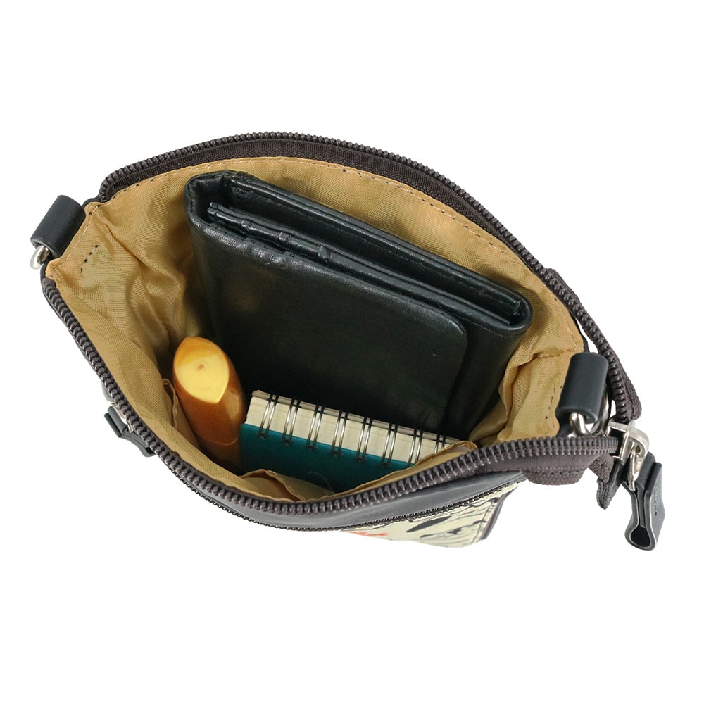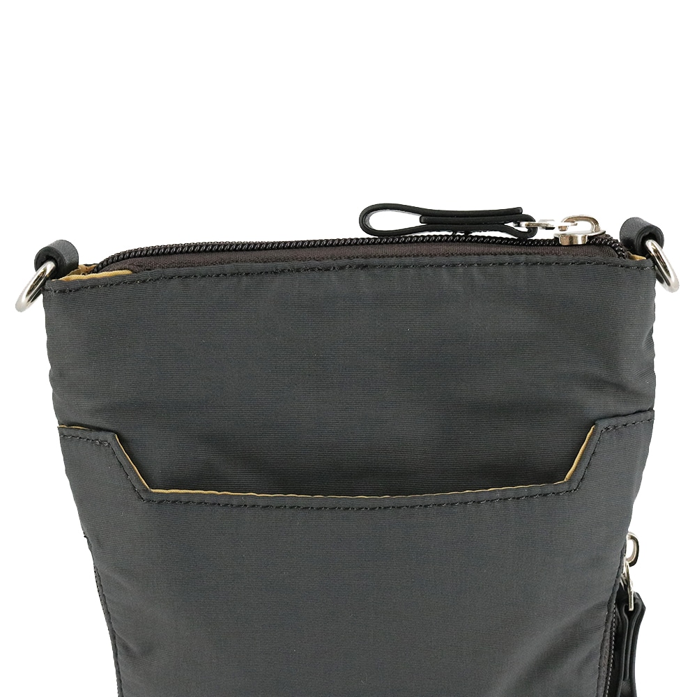 無地のリサイクルナイロンとプリント生地を合わせた、ソフトで軽量な【アベニュー】シリーズの縦型ショルダーバッグ。