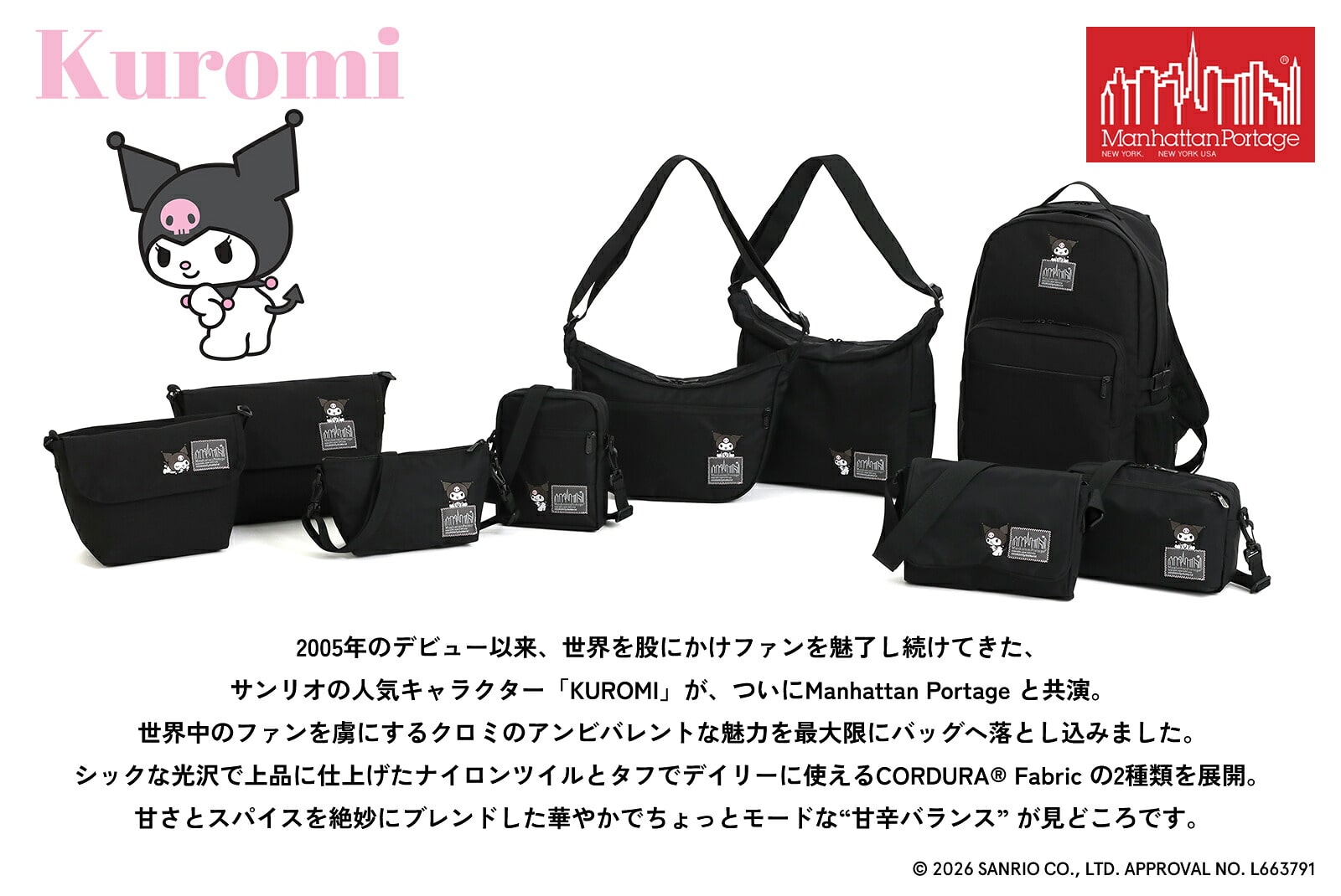 【母の日】 マンハッタンポーテージ サンリオ クロミ 斜め掛けバッグ ナイロンメッセンジャーバッグXS MP1603BPDMGNT500KRM メンズ レディース キッズ コラボ 黒 限定モデル 送料無料 誕生日プレゼント ギフト ラッピング無料 正規代理店 ブラック -1000