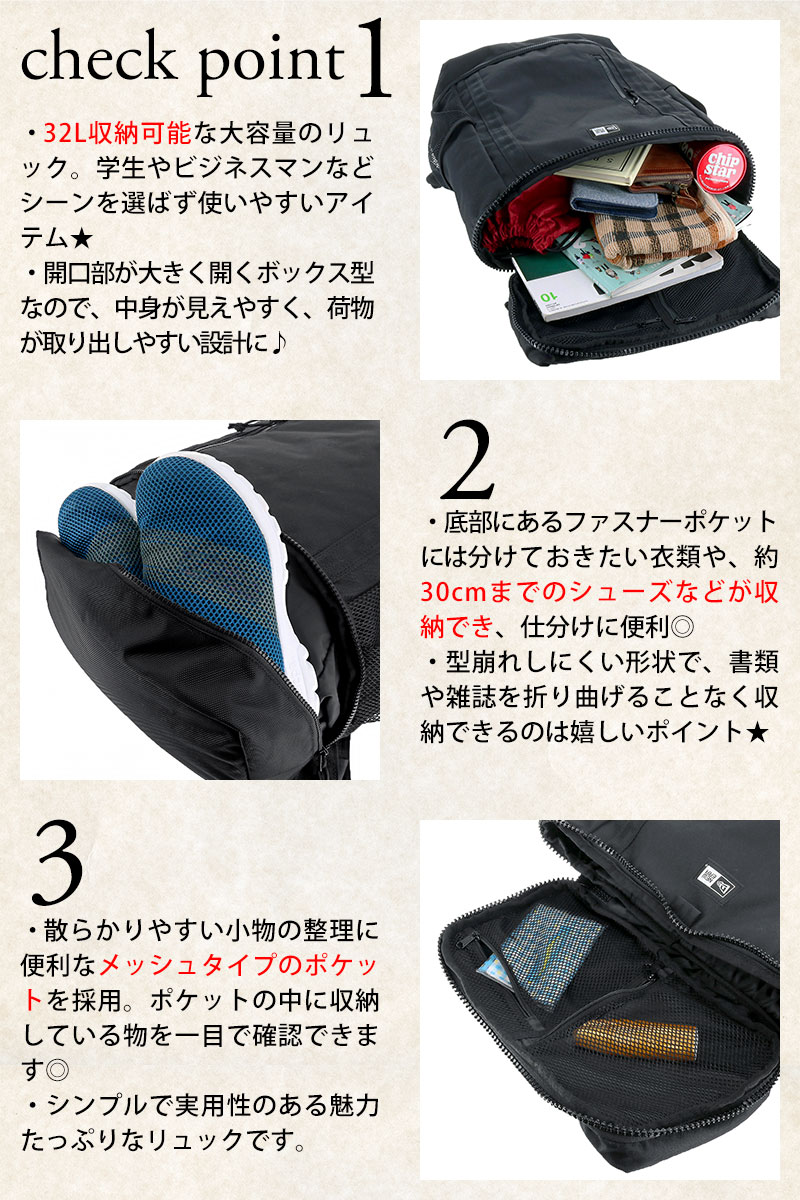 ボックス型のシルエットが特徴的なボックスパックは、その構造から余分な隙間を生まず効率的な収納が可能。