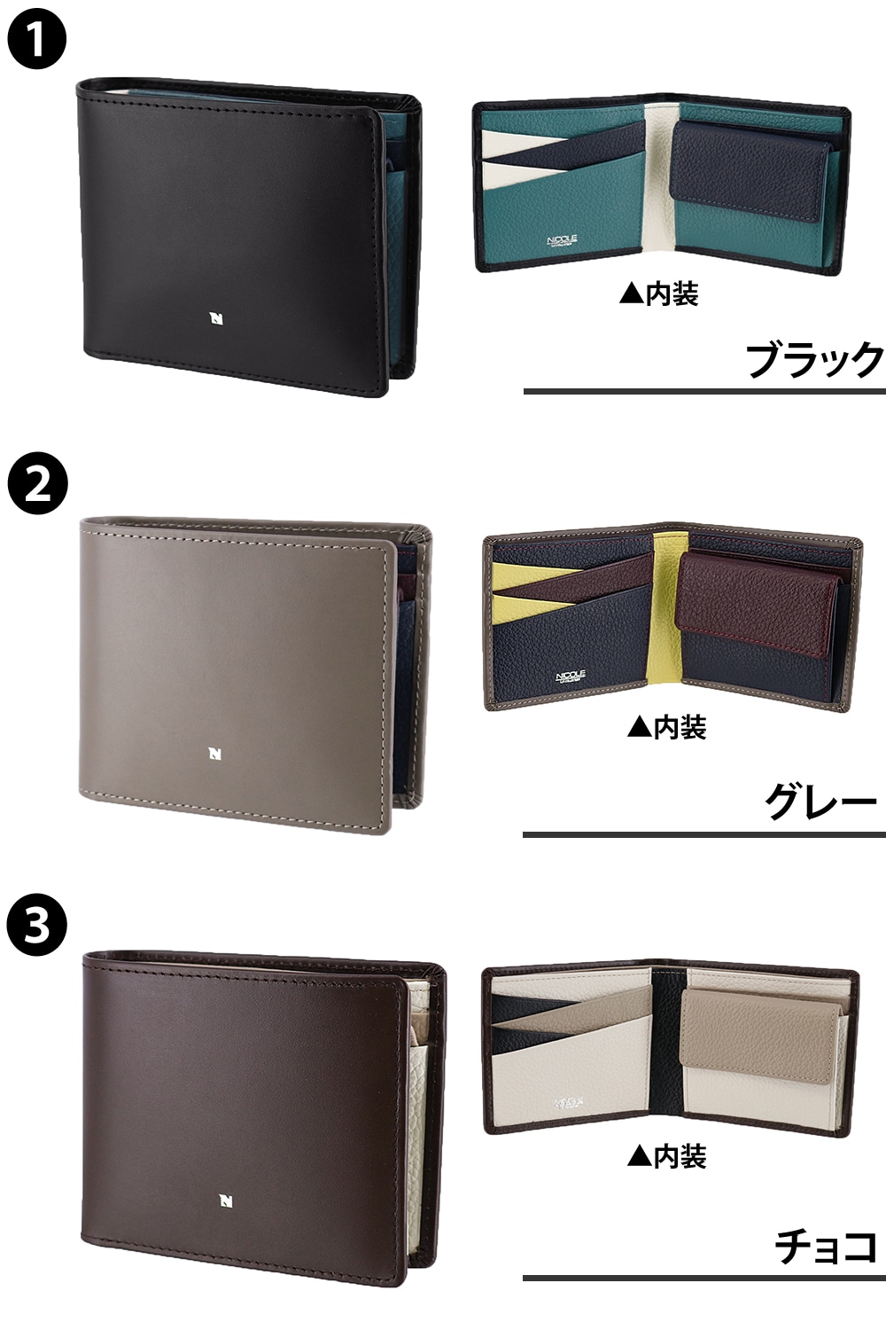 艶やかで品のあるガラス調のレザーに浮かび上がる「N」の文字が映える【ビブラント】シリーズ。
