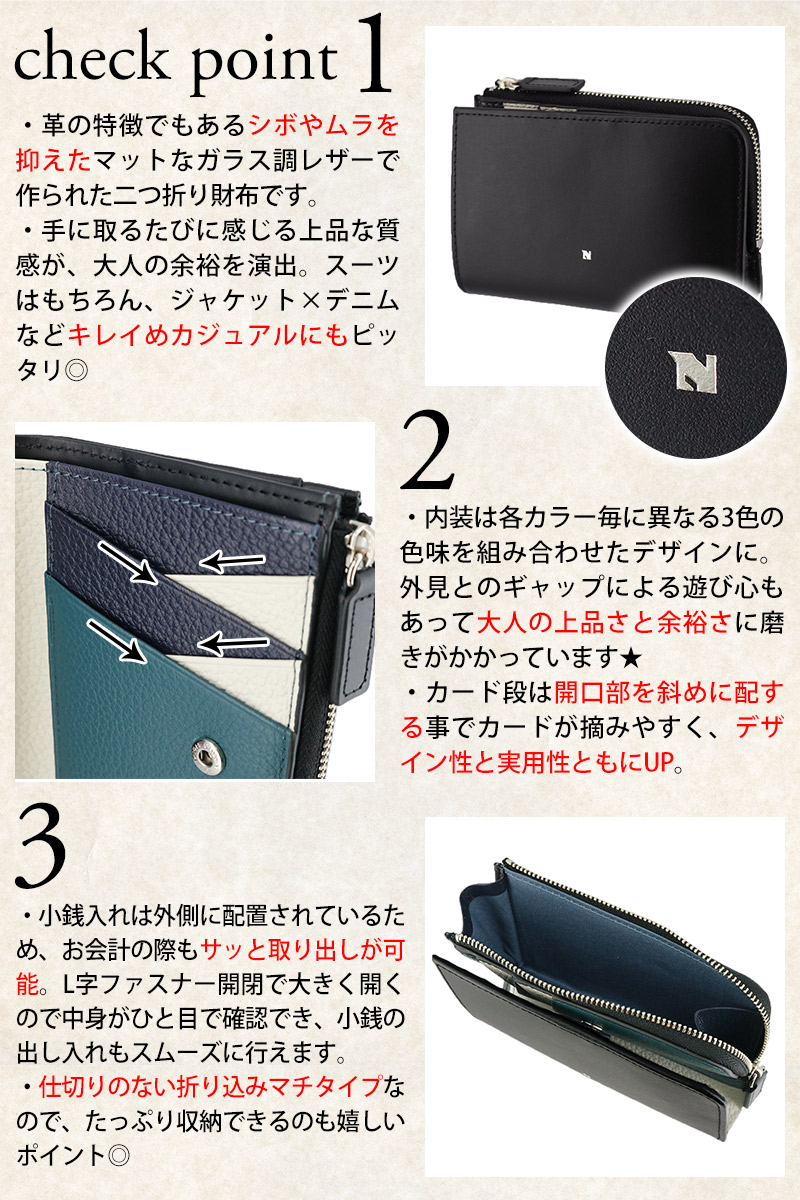 艶やかで品のあるガラス調のレザーに浮かび上がる「N」の文字が映える【ビブラント】シリーズ。