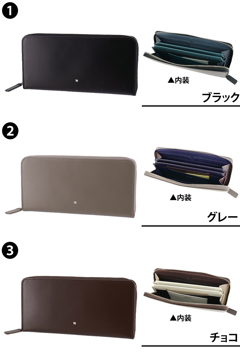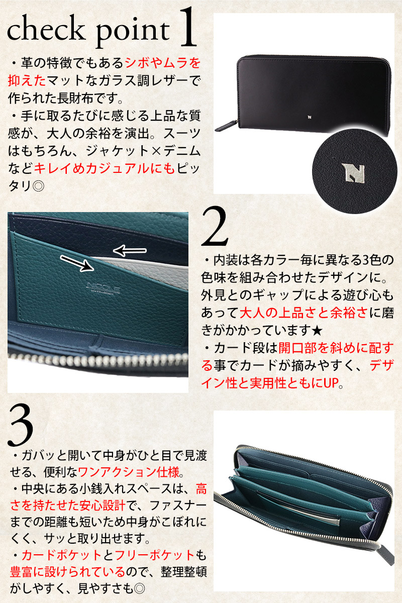 艶やかで品のあるガラス調のレザーに浮かび上がる「N」の文字が映える【ビブラント】シリーズ。