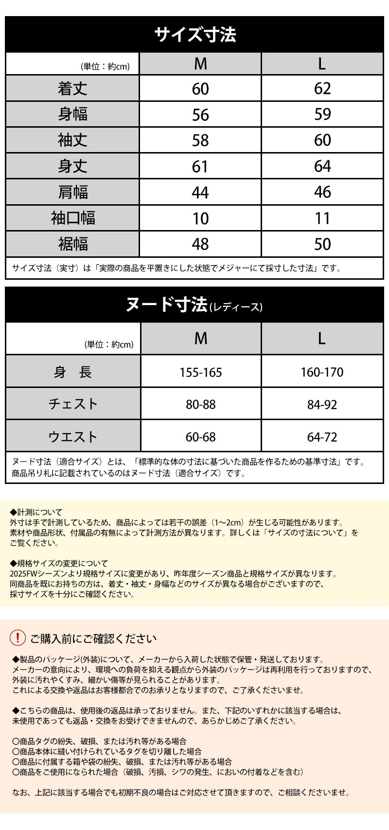 Mサイズ:着丈60cm、身幅56cm、袖丈58cm、身丈(自社採寸)61cm、肩幅44cm、袖口幅10cm、裾幅48cm