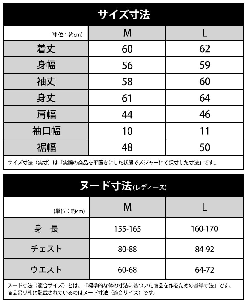 Lサイズ:着丈62cm、身幅59cm、袖丈60cm、身丈(自社採寸)64cm、肩幅46cm、袖口幅11cm、裾幅50cm
