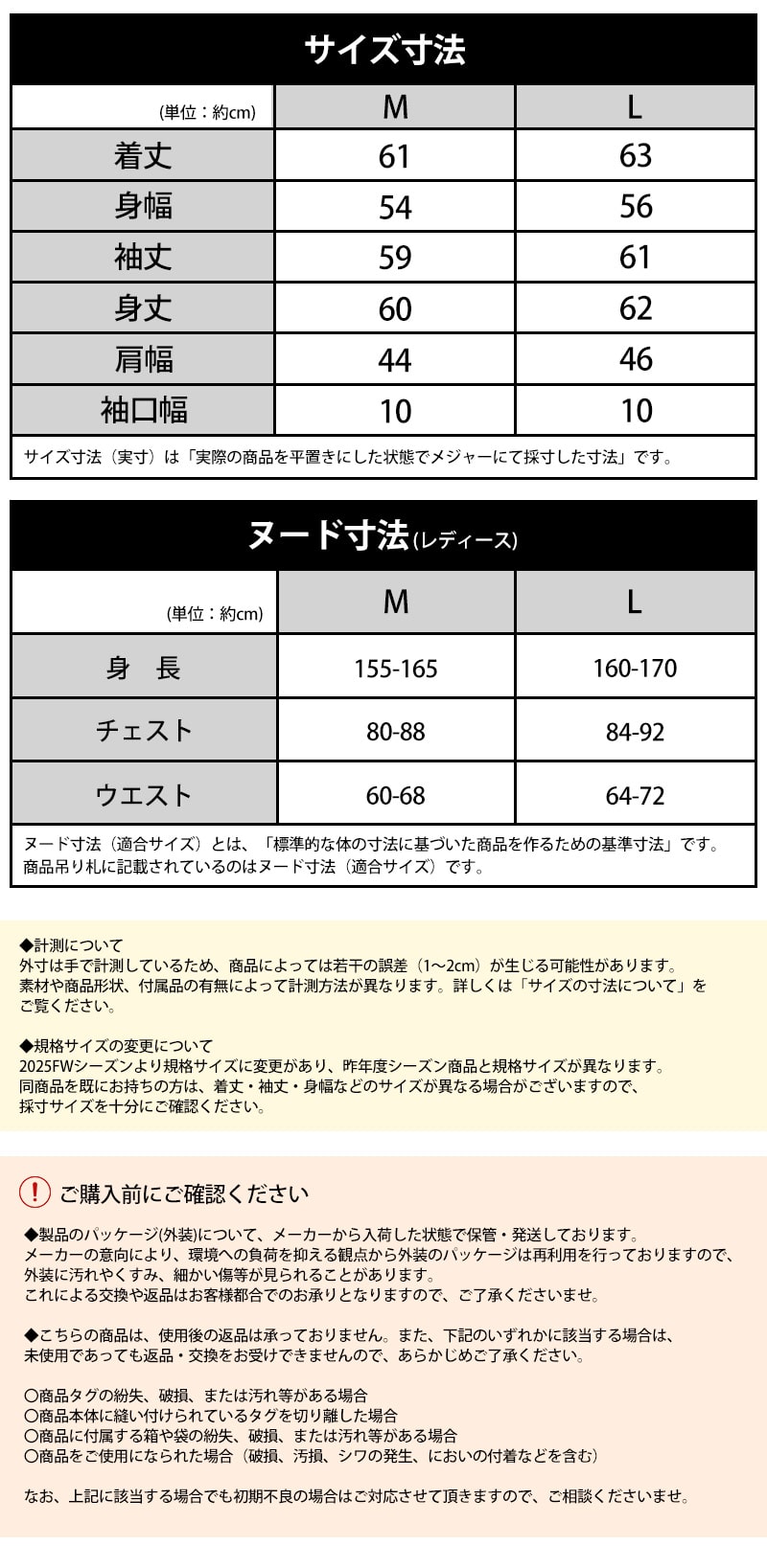 Mサイズ:着丈61cm、身幅54cm、袖丈59cm、身丈(自社採寸)60cm、肩幅44cm、袖口幅10cm
