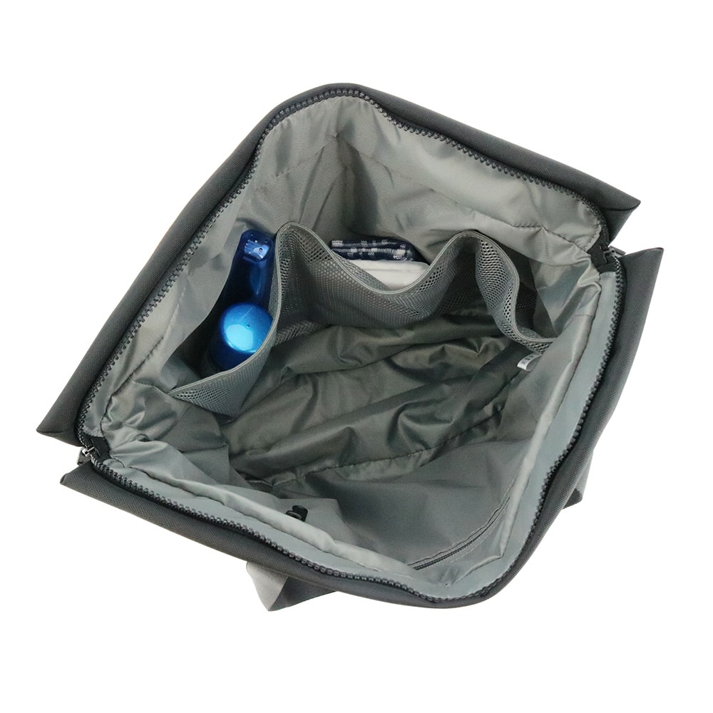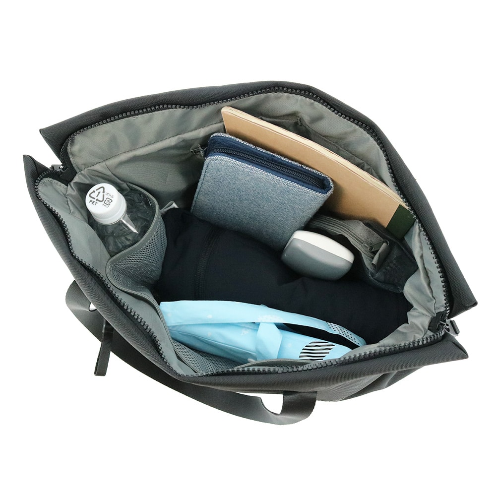 メイン収納部が広いので、A4ファイルや財布、ポーチ等をスムーズに出し入れ可能。