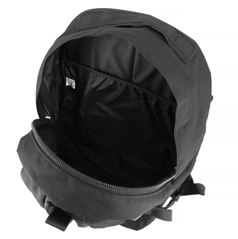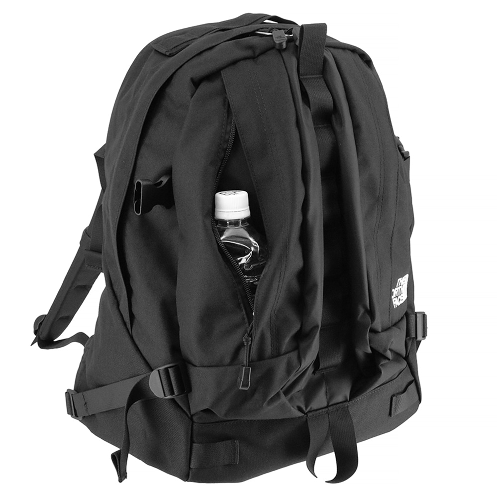 ペットボトルや折り畳み傘が入る縦型のフロント立体ポケットがデザインアクセントにもなったデイパック。