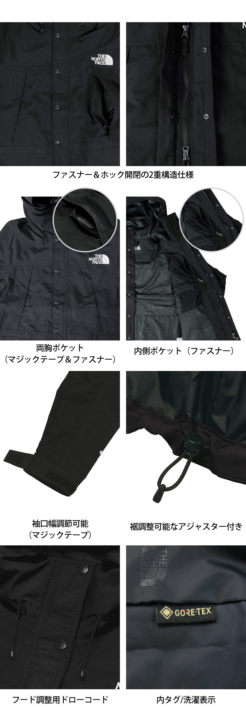 ・GORE-TEX…防水透湿性、防風性を兼ね備えている。耐久性が高く、風雨から体を守る防護性と快適性を保持。