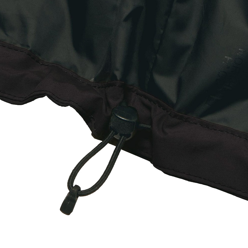 ファスナー+ホックの2重開閉構造。さらに、裾は両脇のアジャスターで簡単に調節可能。