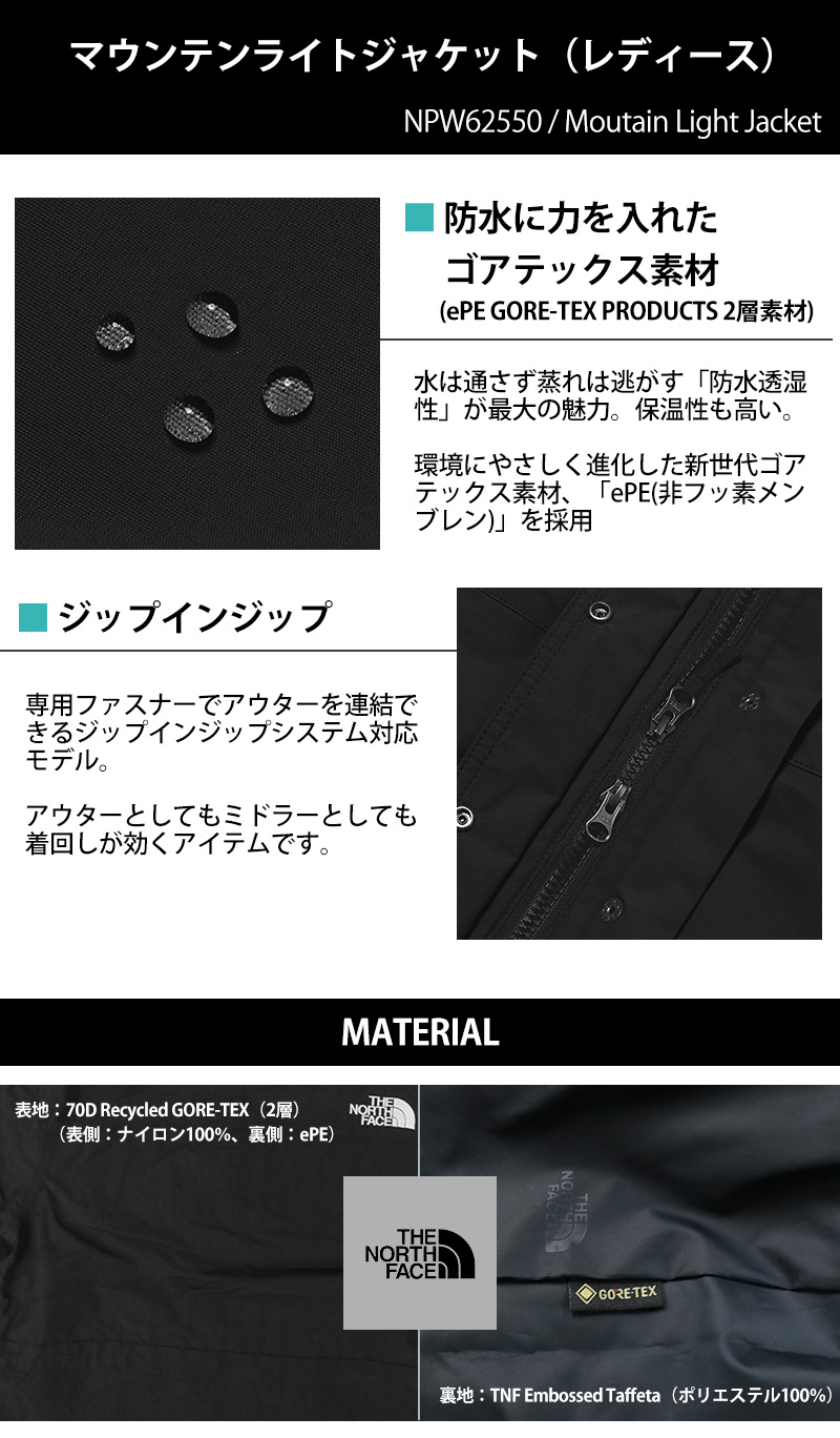 「防水耐久性」「防風透湿性」を兼ね備えたGORE-TEX PRODUCTSの2層構造を採用したシェルジャケット(レディース向け)。