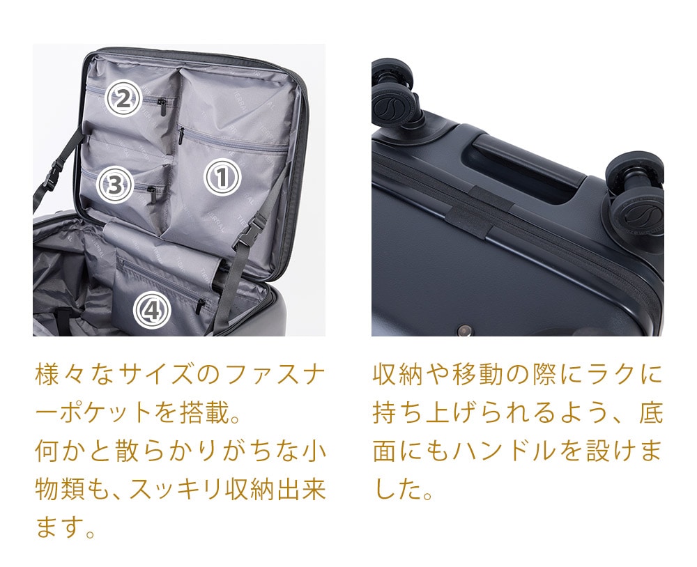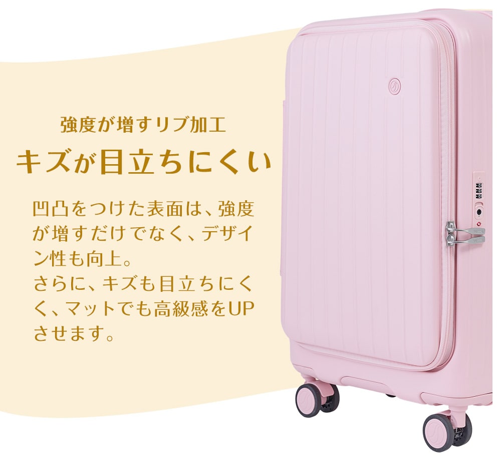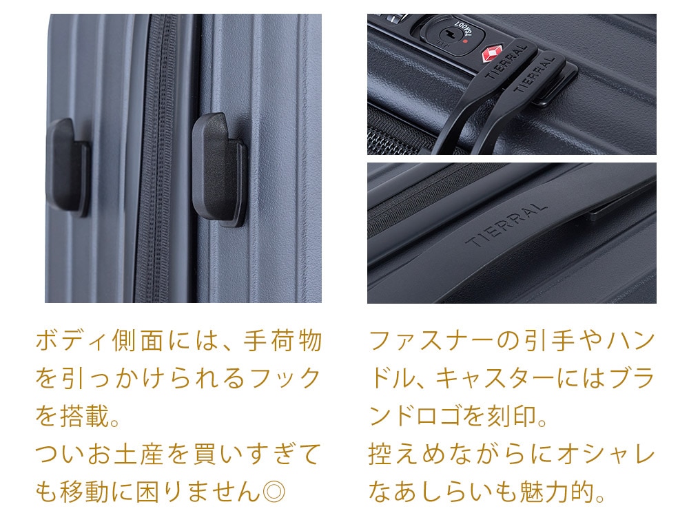 4~7泊程度の荷物が入る中型ハードタイプで、TSAダイヤルロックを搭載したファスナー開閉を採用。
