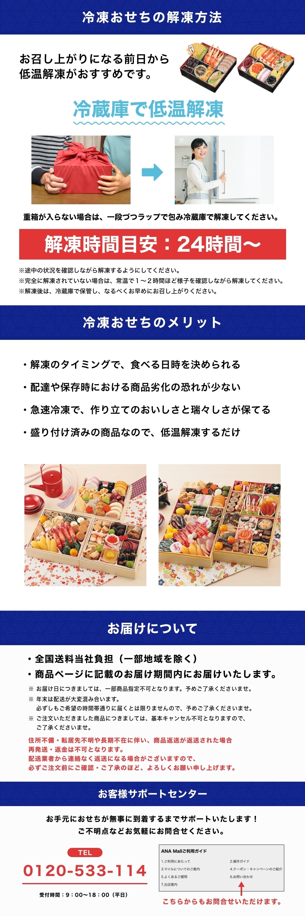 エビチリソース煮、やわらか豚角煮、抹茶ムース、きんとん、黒豆、ふわふわ伊達巻、やわらか海老の艶煮、寿かまぼこ、湯葉のちりめん山椒和え、やわらか昆布巻、ほぐし魚の西京焼、里芋六方の煮物、やわらかごぼうの煮物、なごみ巻(ほうれん草)、椎茸しんじょうの煮物、ふんわり高野豆腐、花形人参の煮物、なますゆず風味いくら添え