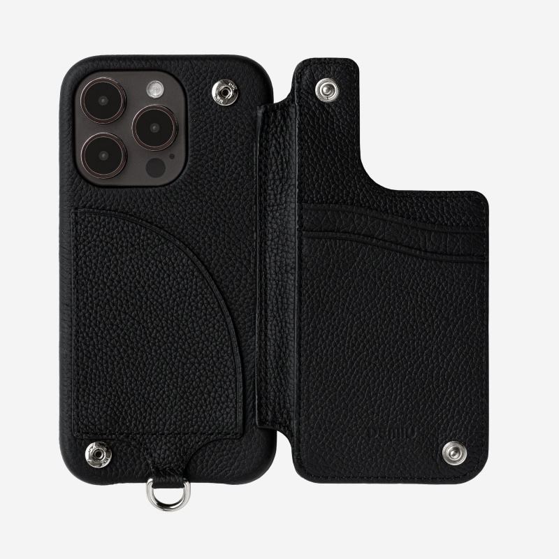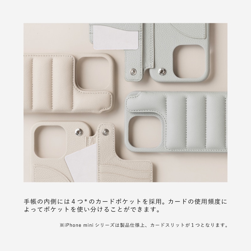 ※iPhone12 miniおよび13miniは左側(ケース装着側)の仕切り部分と、右側の裏ポケットにはカードはお入れいただけません。右側のカード入れは1段のカードスリットとなります。