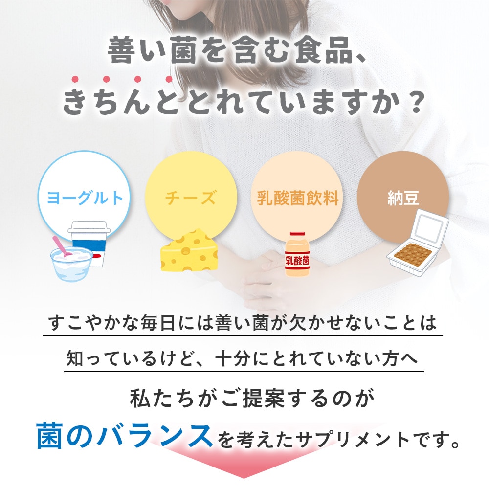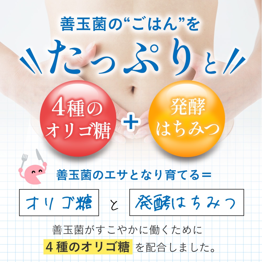 乳酸菌末:16mg/納豆菌培養エキス末:12.5mg/ビフィズス菌末:10mg/ビタミンB群含有酵母:10mg/ミネラル含有酵母:10mg/発酵はちみつ:5mg