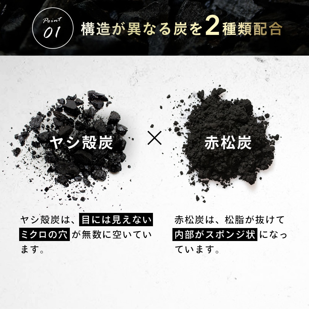 ビートオリゴ糖:50mg/赤松炭:22.5mg/ヤシ殻炭:22.5mg/乳酸菌末:3mg/りんご繊維:2.5mg/黒生姜末:1.5mg/発酵黒タマネギ末:1.5mg/黒梅エキス末:1.5mg/黒酢もろみ末:1.5m/黒胡椒抽出物:1mg