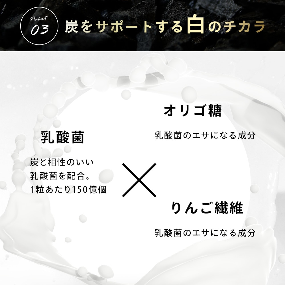 原材料 ビートオリゴ糖(ラフィノース)(国内製造)、赤松炭、ヤシ殻炭、乳酸菌末(殺菌乳酸菌、デキストリン)(乳成分を含む)、りんご繊維、黒生姜末、発酵黒タマネギ末、黒梅エキス末(黒梅抽出物、デキストリン)、黒酢もろみ末、黒胡椒抽出物/結晶セルロース、ゼラチン、ステアリン酸カルシウム、二酸化ケイ素