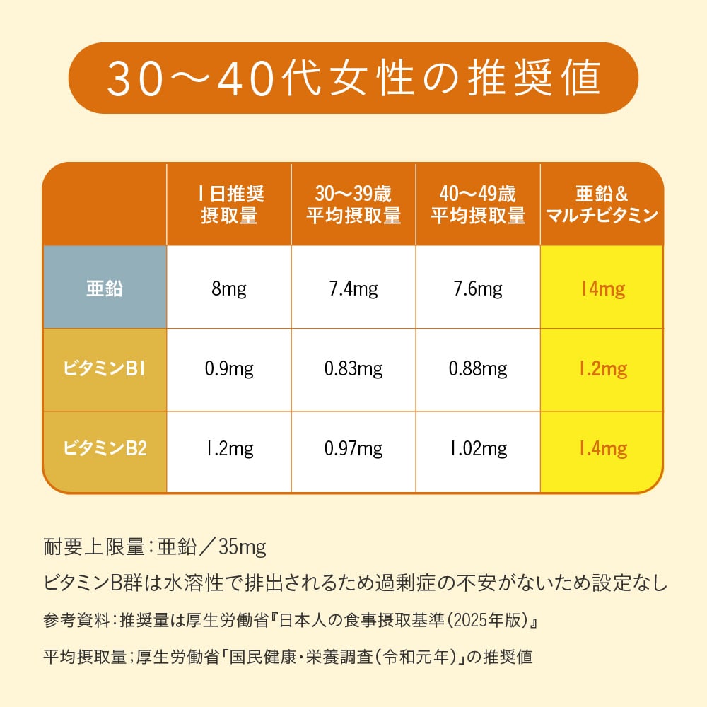 栄養機能表示 ・亜鉛は、たんぱく質・核酸の代謝に関与して、健康の維持に役立つとともに、味覚を正常に保つのに必要な栄養素です。