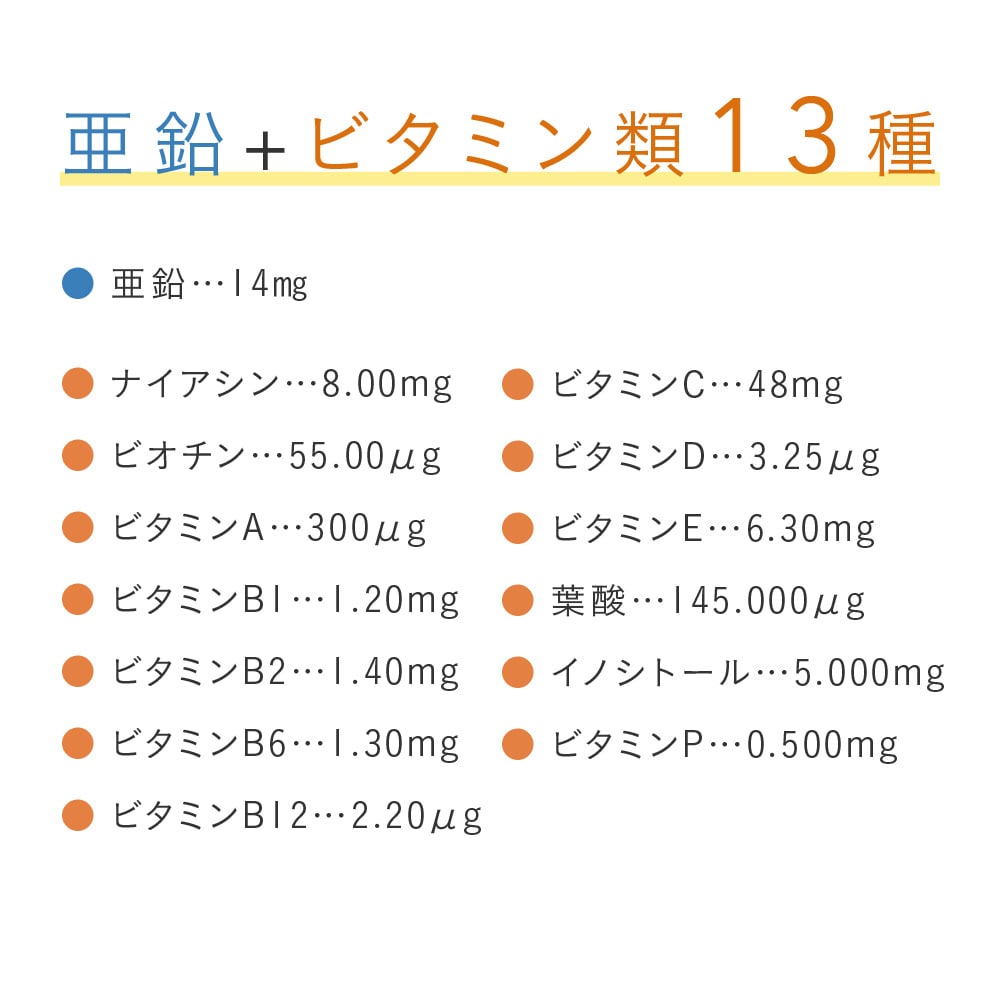 原材料 還元麦芽糖水飴(国内製造)、ビタミンE含有植物油、乳糖(乳成分を含む)/グルコン酸亜鉛、セルロース、ビタミンC、ナイアシン、加工デンプン、パントテン酸Ca、イノシトール、ステアリン酸Cα、ビタミンB6、ビタミンΒ2、ビタミンΒ1、糖転移ビタミンP、ビタミンA、葉酸、ビオチン、ビタミンD、ビタミンB12