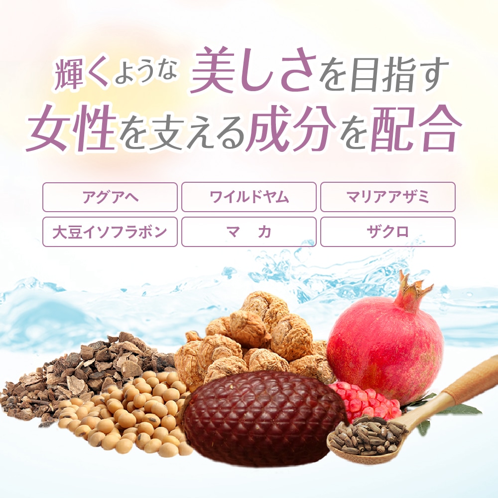 アグアヘエキス末:30mg/大豆胚芽抽出物(イソフラボン含有):1mg/ワイルドヤムエキス末:1mg/マカ末:1mg/マリアアザミエキス末:1mg/ザクロ果実エキス末:1mg/クルミ油:1mg/月見草油:1mg/アマニ油:1mg/アグニ乾燥エキス末1mg