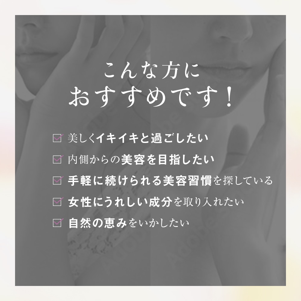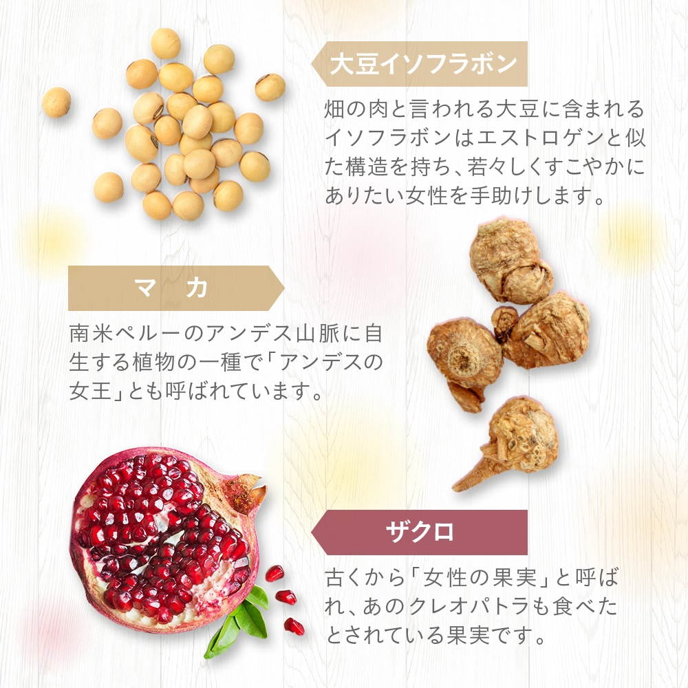 原材料 オリーブ油(スペイン製造)、こめ油、アグアヘエキス末(アグアヘ抽出物、デキストリン)、大豆胚芽抽出物(イソフラボン含有)、ワイルドヤムエキス末(ワイルドヤムエキス、マルトデキストリン)、マカ末、マリアアザミエキス末、ザクロ果実エキス末、クルミ油、月見草油、アマニ油、アグニ乾燥エキス末(アグニ乾燥エキス、デキストリン)、バレリアナ根乾燥エキス末(バレリアナ根乾燥エキス抽出物、デキストリン)/ゼラチン、グリセリン、ミツロウ、グリセリン脂肪酸エステル、β-カロテン、植物レシチン(大豆由来)