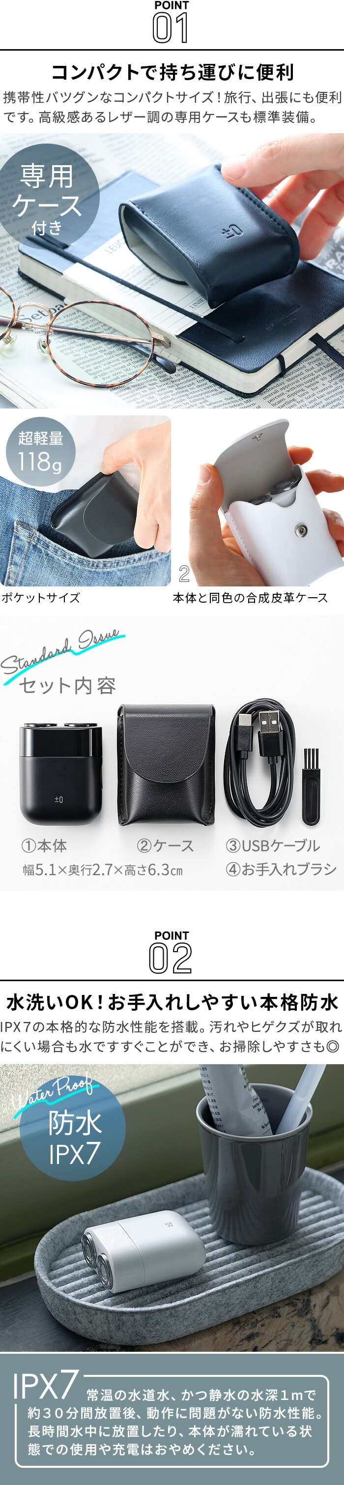 旅行や出張に便利なコンパクトサイズの充電式シェーバーです。高級感あるレザー調のケース入りで、父の日など男性用のギフトとしてもおすすめです。ぱっと見、イヤホンケースかと思うほど小型&軽量だから、持ち運びの負担になりません。また、バッグやポケットの中でも勝手に誤動作しないようロック機能も搭載です。本格的な防水性能を備えており、汚れやヒゲクズも水ですすげるから衛生的に保てます。お手入れブラシも付属しています。