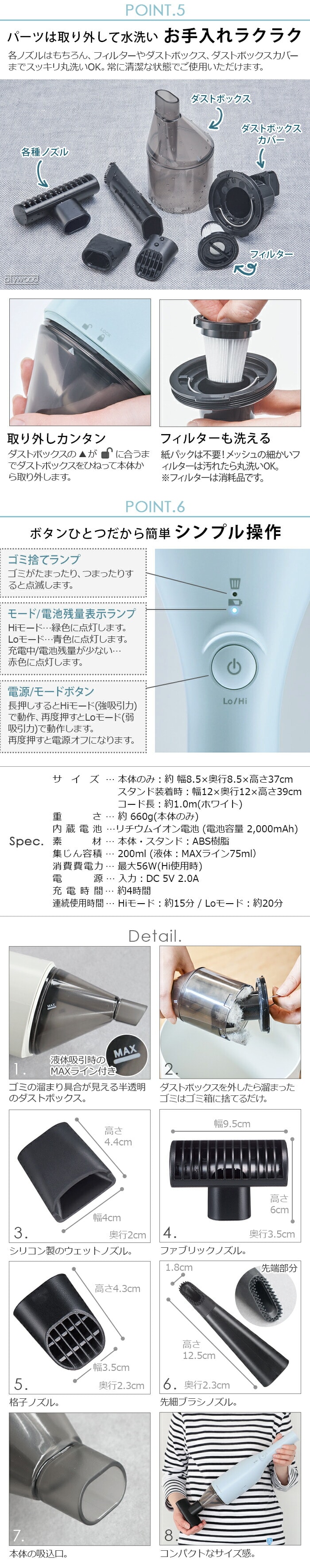 ■備考…USB充電式(コンセントでの充電には電源プラグ(別売り)が必要です。) / 液体もホコリも吸引する乾湿両用 / 4種のノズル付き / 運転モード:LOW(弱) HIGH(強) / DCモーター搭載 / 各種ノズル、フィルター、ダストボックス、ダストボックスカバーは丸洗いOK。
