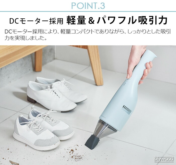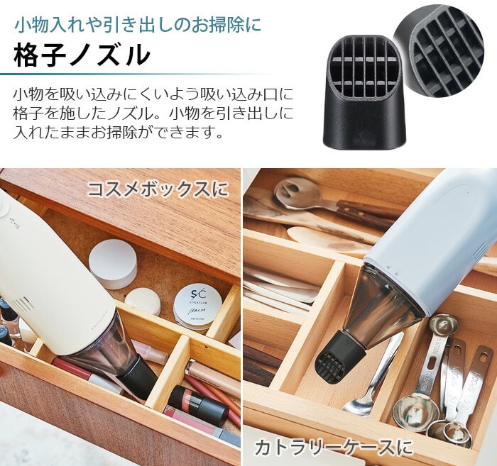 コードレスで使用できるので、キッチンや玄関、車の中、ベランダ、アウトドアまでコンセントの場所を気にせずにどこでも使えます。液体も吸えるため、水回りのお掃除や、お子さまやペットが飲み物をこぼした時などにサッと吸引できるから1台あるとすごく便利!コンパクトな本体にはDCモーターを採用。小さくてもしっかりとゴミ・水を吸える吸引力に加え、出しておいてもインテリアとして美しいデザインです。直径12cm、自立するので置き場所にも困りません。